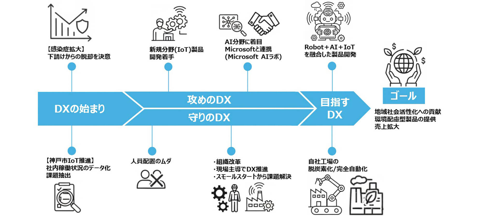 さらに、受け身の事業体質から脱却し、付加価値を生み出す企業への転換を目指して、IoTやAIの活用に挑戦し、自社発の製品・サービスを展開する「攻めのDX」を推進しました。