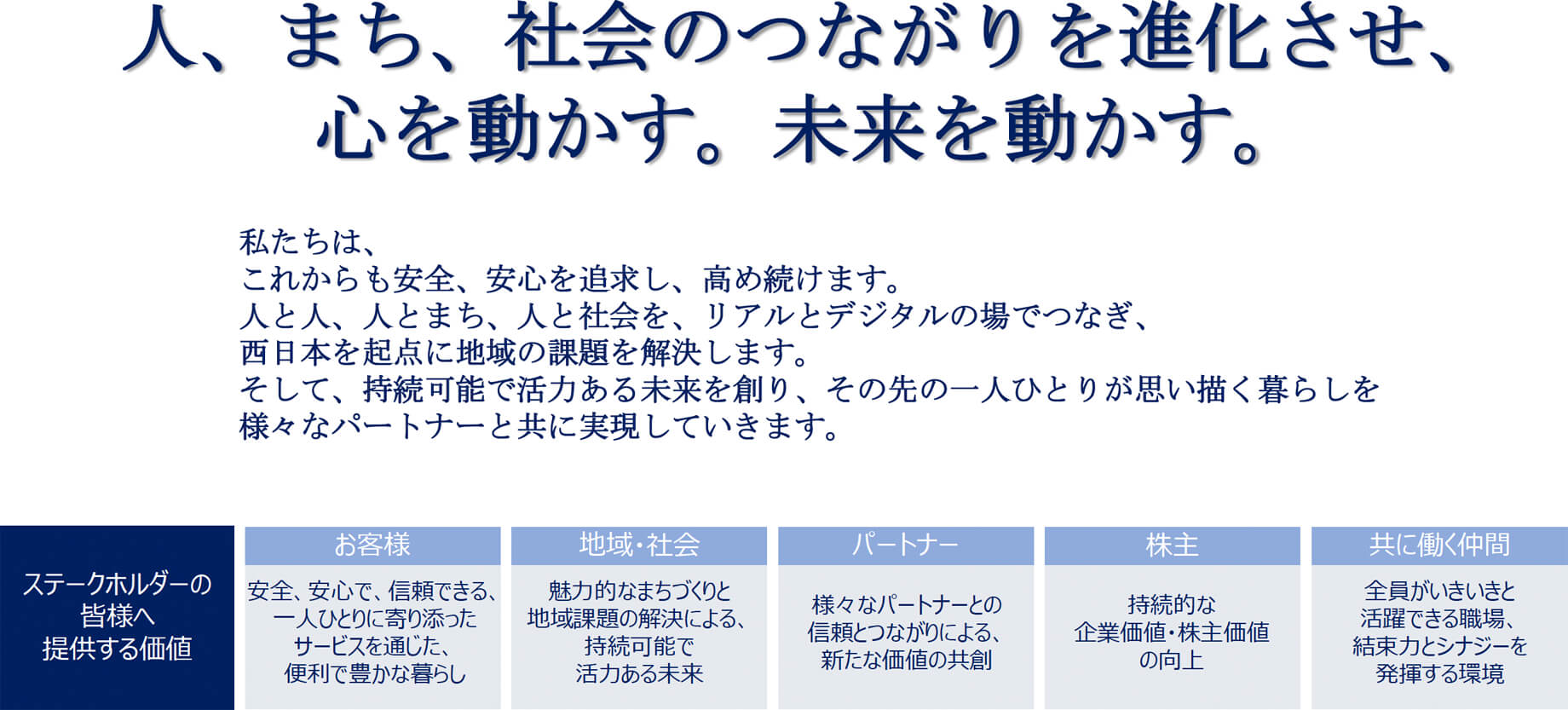 「私たちの志」には、これまでに培った駅などのリアルな接点を活かしつつ、①「リアル×デジタルの融合」により価値を提供する、②データやテクノロジーを駆使し、One to Oneのサービス提供を行う、③当社のサービスを「プラットフォーム化」する、④鉄道や移動にかかわらず、様々な社会課題解決に挑戦し、持続可能な未来を自ら創出するといった思いを込めており、データ・テクノロジーを駆使した新たな価値を提供することを世の中に宣言した。