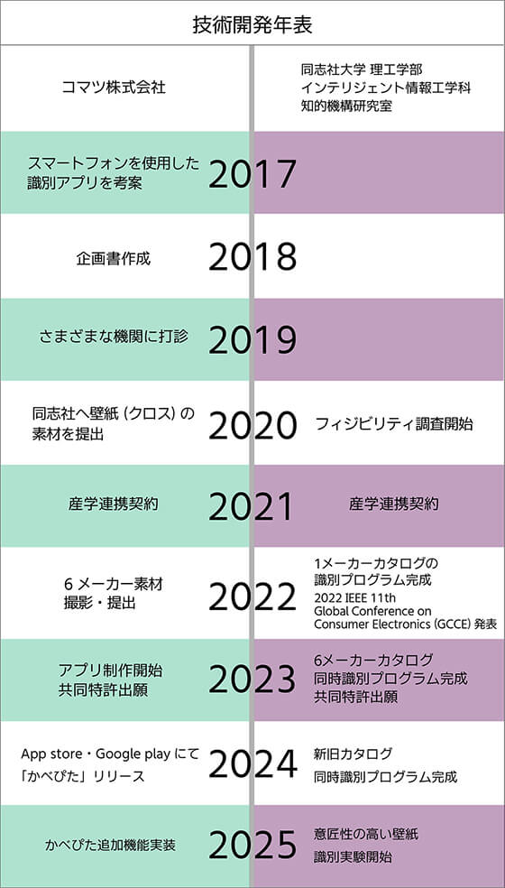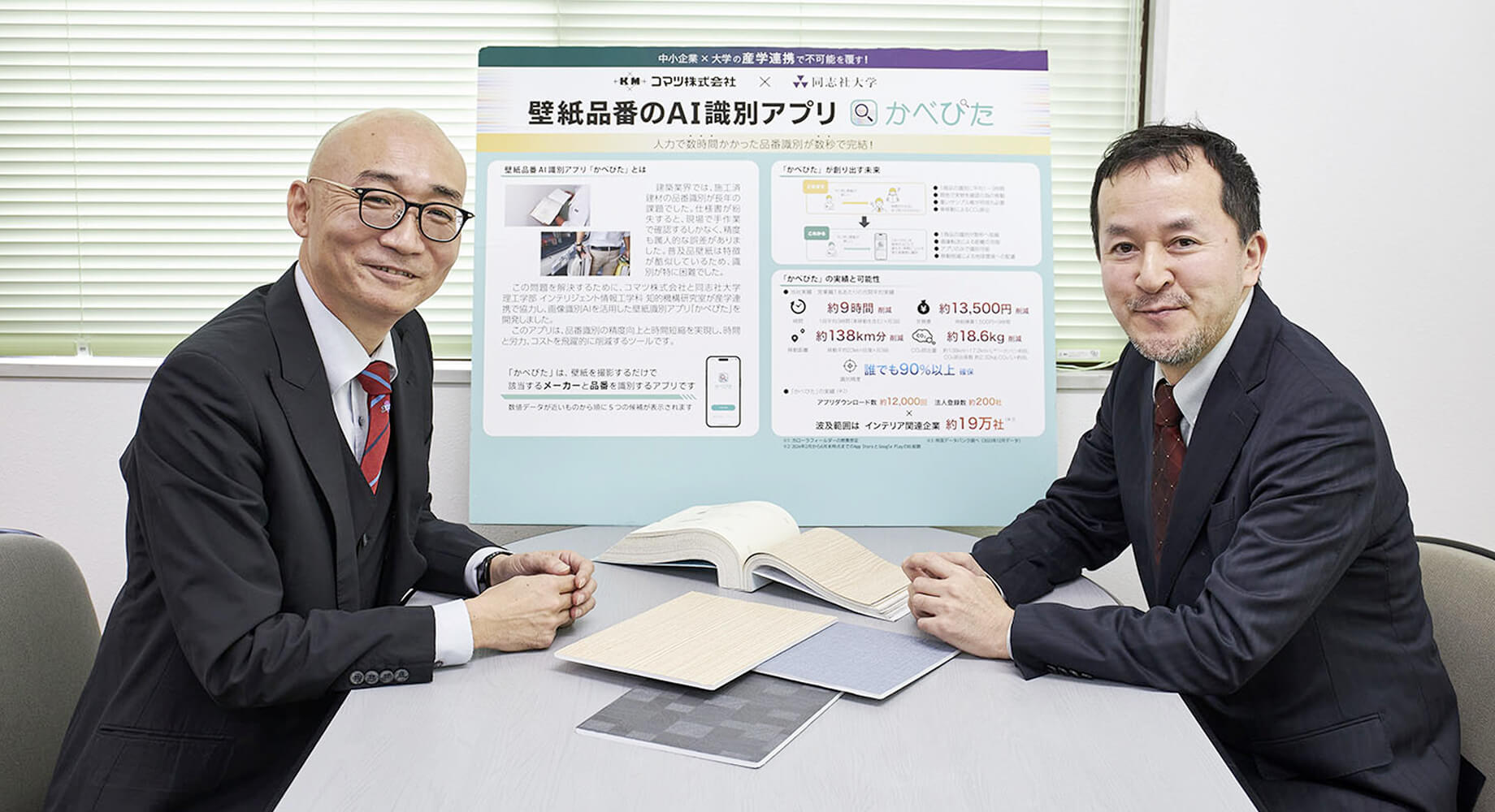 データセット作成にあたり、小松氏は国内大手壁紙メーカー6社の協力を得ることに尽力した。メーカーとしては競合関係にあるため困難もあったが、最終的には「業界全体のため」との思いを理解してもらったという。そして、コマツと同志社大学との共同で、これまでにない自動テクスチャ識別プログラム(特許第7594066号)を開発。2023年12月、高精度な壁紙識別ができる壁紙AI識別アプリ「かべぴた」をリリースし、現在は無料で公開している。