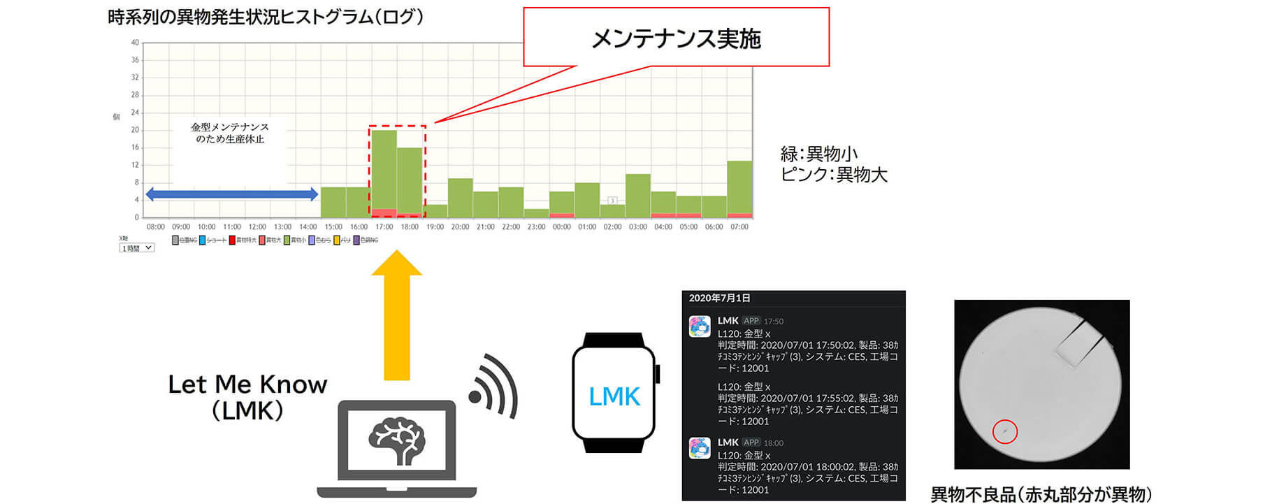 成形機にはセンサーを設置し、「MiS(Molding Information System)や「My CFM(My Clamping Force Monitor)」といったシステムを導入。My CFMでは金型をしっかり閉じた状態に保つために必要な力である型締力をリアルタイムで監視し、熟練者の感覚に頼っていた微細な異常も数値で把握できます。MiSと連携することで、異常の早期検知や予防保全、不良原因の特定が可能です。さらに、データ監視・自動通知システムである「Let Me Know」により、異常発生時には作業者や管理者のスマートウォッチに通知され、現場外でも迅速に対応できます。